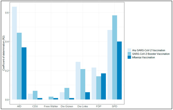 Explained variance in regional uptake of vaccines by political support for the seven strongest parties in Saxony and Saxony-Anhalt (AfD–Alternative for Germany; CDU–Christian Democratic Union of Germany; Freie Wähler–Free Voters; Die Grünen–The Green Party; Die Linke–The Left (party); FDP–Democrats; SPD–Social Democratic Party of Germany).