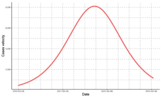 The velocity of the progression of COVID-19 cases represented by the red line. The graph depicts the critical time of the progression at which Peru had the maximum daily value for cases.
