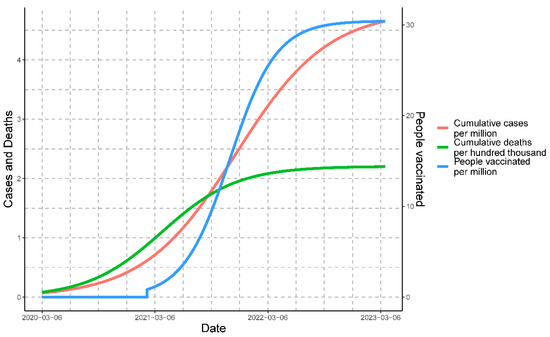 The epidemiological scenario for the cumulative data for the three variables simultaneously can be observed in Figure 4. The graph shows the temporal progression of COVID-19 cases, deaths, and people vaccinated in Peru from March 2020 to March 2023. The graph depicts the cumulative cases and people vaccinated per million, along with the cumulative deaths per hundred thousand.