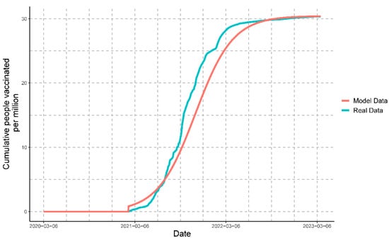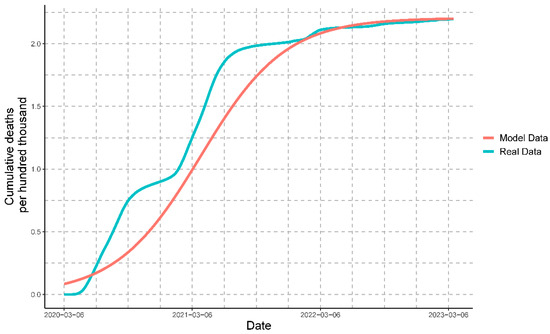 The comparison of the real data with the data obtained by the mathematical model for cases, deaths, and people vaccinated resulted in the following coefficients of determination (): , , and , respectively. These values indicate that the mathematical model strongly represents the real data for all of the variables.