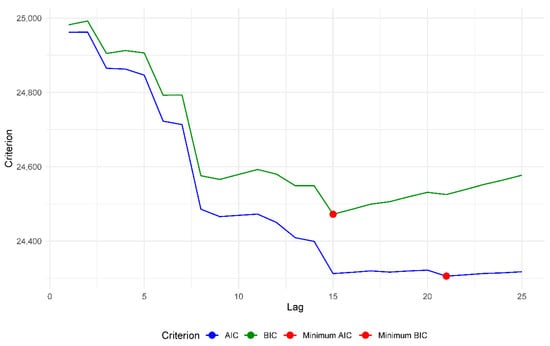 Both the Granger causality test and the augmented Dickey–Fuller test require that a lag value be specified. For this purpose, the Akaike information criterion (AIC) and the Bayesian information criterion (BIC) were used. These criteria are used to compare different models with different lag values and determine which one provides the best fit to the data, because their performance depends on the sample size and the lag order [32,34]. The information criteria penalize models that are more complex in terms of the number of lags included [35]. Therefore, by calculating these criteria for various lag values, one can identify the model that has the lowest value of AIC or BIC, which suggests that it is the best-fitting model for one’s data, i.e., the lag value that minimizes AIC or BIC is the one that is considered optimal according to these criteria.