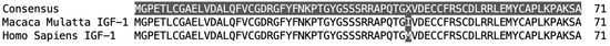 Geneious Prime® alignment of the amino acid sequences of the IGF-1 proteins of rhesus macaque (Macaca mulatta) and human (Homo sapiens). The top row indicates consensus between the two sequences. The difference in position 44 (I—Isoleucine vs. M—Methionine) is highlighted.