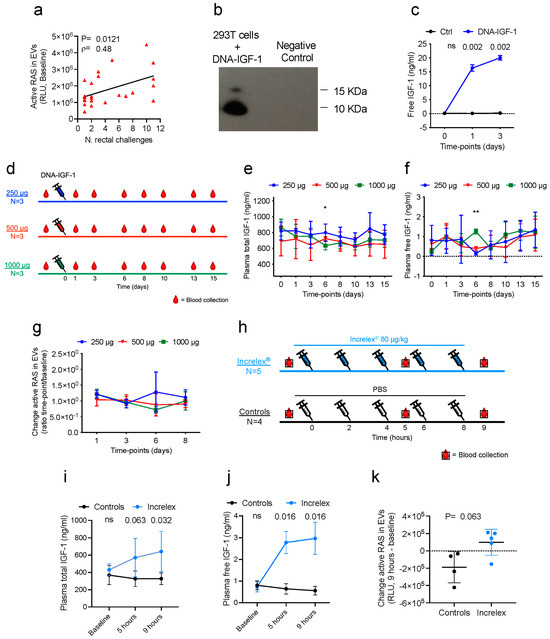 Next, we performed a dose–response study through administering 250, 500, and 1000 μg of DNA-IGF-1 intramuscularly to three groups of three macaques each (nine animals total; Figure 2d). Blood was collected prior to administration and at several timepoints (1, 3, 6, 8, 10, 13, and 15 days) following the administration, and the content of total and free IGF-1, as well as RAS activation, were evaluated. The total and free IGF-1 plasma levels did not change significantly in the three groups except transiently at day 6, when the three groups differed in their total IGF-1 (p = 0.025; Figure 2e) and free IGF-1 (p = 0.0036; Figure 2f) levels. However, these differences may be due to normal fluctuation in IGF-1 levels, as reported in humans [38], rather than a consequence of the administration of different amounts of DNA-IGF-1. Following the isolation of plasma EVs and the evaluation of active RAS levels, no significant changes in RAS activation were identified in the three groups (Figure 2g). We next tested the ability of the FDA-approved recombinant human IGF-1 protein, Increlex®, to induce RAS activation in macaques in vivo. We treated five macaques with five injections of 80 μg/kg each of Increlex® and four macaques with saline at the same timepoints, as controls (Figure 2h). Each injection was subcutaneously administered at 2 h intervals, and blood was collected before the first inoculation, 1 h following the third and fifth injections (5 and 9 h, respectively). As expected, the levels of total (p = 0.063 and 0.032, Figure 2i) and free (p = 0.016; Figure 2j) IGF-1 in plasma were significantly higher in the Increlex®-treated animals compared to the saline controls. Additionally, active RAS levels measured in plasma EVs trended higher in Increlex®-treated animals than in controls (p = 0.063; Figure 2k).