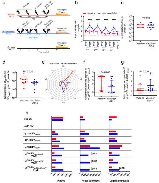 Vaccination in association with IGF-1 administration and antibody responses. (a) Schematic study design with immunization schedule, in association (blue) or not (red) with DNA-IGF-1 and Increlex® administration (weeks 0–12) and SIVmac251 challenges (weeks 17–27). (b) Plasma levels of free IGF-1 (ng/mL) in animals vaccinated in association or not with IGF-1 administration. Levels were tested prior to and following each immunization, and at the first challenge (week 17). (c) Serum IgG antibody titers to whole SIVm766 gp120 in vaccinated (n = 13) and vaccinated+IGF-1 (n = 12) animals at week 14. (d) Neutralizing antibody responses (ID50) to tier-1A SIVmac251.6 in serum of vaccinated (n = 13) and vaccinated+IGF-1 (n = 12) animals in week 14. (e) Radar plots showing the antibody responses to constant and variable regions of SIVm766 gp120 in serum of vaccinated (n = 13) and vaccinated+IGF-1 (n = 12) animals in week 14. Data are plotted as median of normalized z-scores for each region across all the animals. Comparisons were performed using the Mann–Whitney U test on the absolute values (optical densities, ODs) between vaccine and vaccine+IGF-1 groups. (f,g) Antibody response (OD) to peptides (f) 17 and (g) 25 of SIVm766 gp120 in serum of vaccinated and vaccinated+IGF-1 animals in week 14. (h) Summary graph representing the IgG antibody responses to p55 gag, gp41, and gp120 proteins and gp70 V1/V2 scaffolds in plasma, and rectal and vaginal secretions of vaccinated and vaccinated+IGF-1 animals in week 14. For vaginal secretions, 3 vaccinated animals and 4 vaccinated+IGF-1 animals were excluded due to blood contaminations. Data are represented as the median of the absolute values of the MFI for plasma and the specific activity for rectal and vaginal secretions. Comparisons were performed using the two-tailed Mann–Whitney U test on the absolute values between vaccine and vaccine+IGF-1 groups. Comparisons: (b,h) two-tailed Mann–Whitney U test with mean and SD; (c) two-tailed Mann–Whitney U test and median; (d,f,g) two-tailed Mann–Whitney U test and mean with SD. Statistical significance: **** p < 0.0001. (b,f,g) dotted lines represent the zero value.