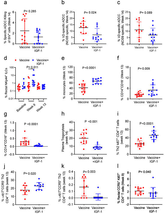 IGF-1 treatment also resulted in a lower frequency of mucosal vaccine-induced CD4+ T-cells (collected at week 9) expressing CCR5, as compared to macaques who received the vaccine only (p = 0.040; Figure 4l).