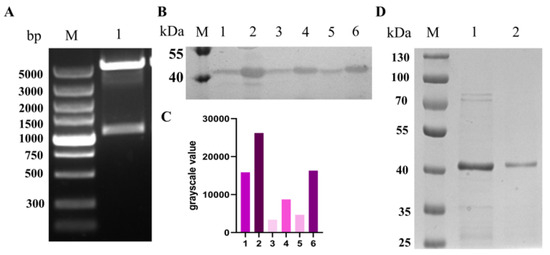 The intact coding sequence (1011 bp) of the SAG1 gene was amplified by PCR and inserted into the pET28a vector through EcoRI and XholI enzyme digestion and T4 DNA ligase (Figure 1A). The resulting recombinant plasmid, named pET28a-SAG1, was then transformed into E. coli Transetta (DE3) cells, which supplemented rare codons of the SAG1 gene, including AGA, AGG, TGA, and CGA. Three randomly selected monoclonal colonies could all express the SAG1 recombinant protein in a soluble form, as indicated by detecting the desired protein in the cell lysis supernatant (Figure 1B,C). SDS-PAGE analysis was used to characterize the purified SAG1 recombinant protein after it was isolated using affinity chromatography (Figure 1D).