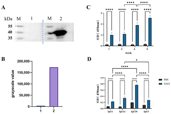 Serum IgG, IgG1, IgG2a, IgG2b, and IgG3 antibody levels in immunized and control mice. (A) Western blot analysis for native SAG1 in TLA with the experimental mouse sera. 1: The reaction of TLA with the sera isolated from mice in the control group; 2: The reaction of TLA with the sera isolated from mice in the immunized group; M: Stander protein marker. (B) The grayscale values of bands in Western blot were analyzed by Image J soft V 1.54d. (C) Detection of IgG antibodies in the serum of Balb/c mice 2, 4, 6, and 8 weeks after the initial vaccination. (D) IgG1, IgG2a, IgG2b, and IgG3 antibody detection in immunized mice on the 14th day after the last immunization. Data of mice in each group are shown as mean ± SD (n = 6), with statistical significance represented by asterisks (* p < 0.05, **** p < 0.0001).