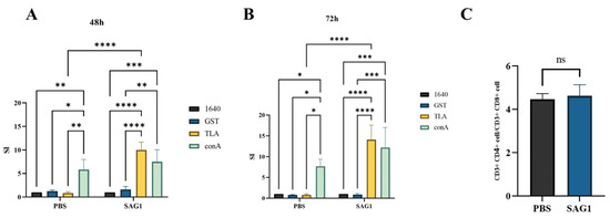 Spleen cell proliferation and T cell subtype analysis of immunized mice. (A) Spleen cell proliferation after 48 h of stimulation with TLA, ConA (positive control), GST (negative control), and 1640 (blank control). (B) Spleen cell proliferation after 72 h of stimulation with TLA, ConA (positive control), GST (negative control), and 1640 (blank control). (C) T cell subtype analysis by flow cytometry. Data for three mice in each group are displayed as mean ± SD (n = 3), with asterisks indicating statistical significance (* p < 0.05, ** p < 0.01, *** p < 0.001, **** p < 0.0001, and ns, no significance).