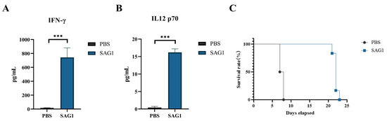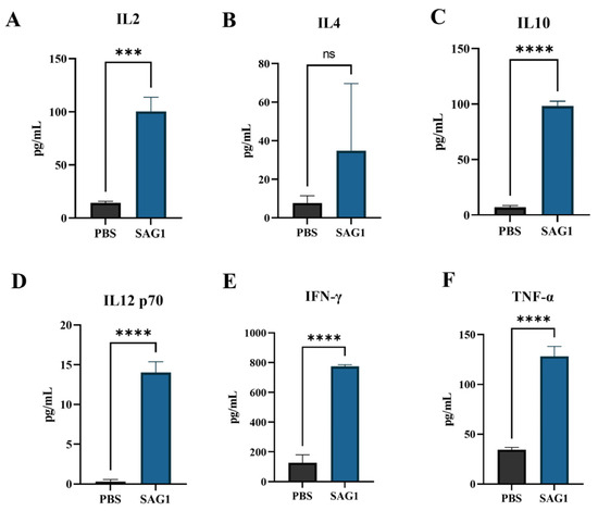Female Balb/c mice aged six to seven weeks were divided into two groups, each containing 12 mice. The control group was immunized with an equal volume of PBS mixed with the same adjuvant. For the first immunization, 100 μg of SAG1 recombinant protein was mixed with an equal volume of Freund’s complete adjuvant (Sigma-Aldrich, Louris, MI, USA) and injected subcutaneously into the experimental group. Subsequent three immunizations were administered at 2-week intervals using an equal volume of Freund’s incomplete adjuvant (Sigma-Aldrich, Louris, MO, USA). At 2, 4, 6, and 8 weeks after the first immunization, blood was drawn from the tail veins of the six same mice in each group. Sera were collected and centrifuged at 4000× g for 5 min before being kept at −20 °C. Two weeks after the fourth vaccination, nine mice per group were intraperitoneally infected with 50 T. gondii RH strain tachyzoites and further randomly divided into two groups; one group of 6 mice was used to observe survival time, and the other group of 3 mice was used to detect cytokine levels in the serum on the seventh day after infection.