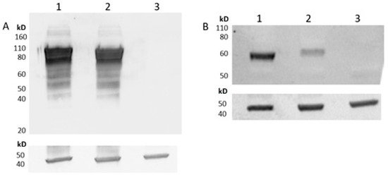 Expression of VZVgE (A) and RSVpreF (B) antigens in infected cell lysates as assessed via Western blot (upper panels). Lane 1: ChAdOx2-VZV-RSV, Lane 2: ChAdOx2-RSV-VZV, Lane 3: ChAdOx2-SEAP (negative control). Actin was used as a loading control (lower panels).