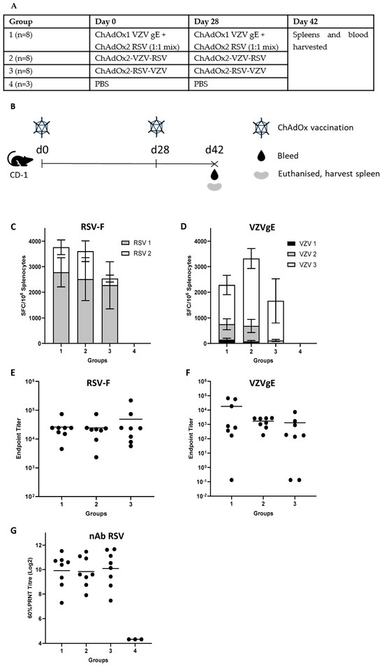 Mouse study to assess cellular and humoral immune responses after vaccination. (A,B) Experimental design: treatment groups and regimens. (C) T cell responses (as assessed via IFN-g ELISpot, mean with SEM per group) against RSVpreF peptide pools (RSV 1 and RSV 2). (D) T cell responses (as assessed via IFN-g ELISpot, mean with SEM per group) against VZVgE peptide pools (VZV 1, VZV 2, VZV 3). (E) Humoral immune responses (endpoint titres) as assessed via RSV-F ELISA. (F) Humoral immune responses (endpoint titres) as assessed via VZV gE ELISA. (G) Neutralising antibody (nAb) responses as assessed via RSV 60% plaque-reduction neutralising test (PRNT60) against live RSV strain A2. Horizontal lines represent mean values per group (E–G). No statistically significant differences were found between groups 1–3 in any datasets shown (C–G).