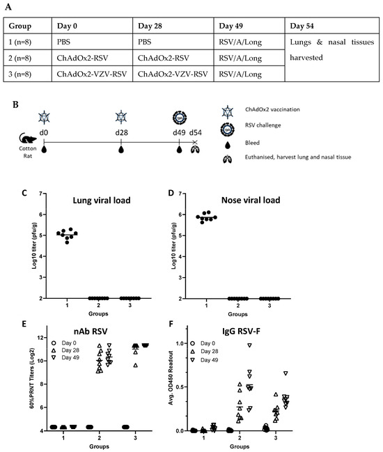 In order to evaluate the efficacy of our preferred candidate, we assessed the ability of the ChAdOx2-VZV-RSV vector to protect against RSV infection in a cotton rat challenge model, a commonly used animal model for preclinical studies of RSV infection and vaccine-induced protection [67,68]. Monovalent ChAdOx2-RSV was included as a control to compare the efficacy of monovalent and bivalent vectors. As indicated in Figure 3A, cotton rats received either PBS (group 1), ChAdOx2-RSV (group 2) or ChAdOx2-VZV-RSV (group 3) on days 0 and 28. The animals were then challenged on day 49 with RSV/A/Long before being sacrificed at day 54, with blood, nasal tissue and lungs taken for further analysis (Figure 3B).