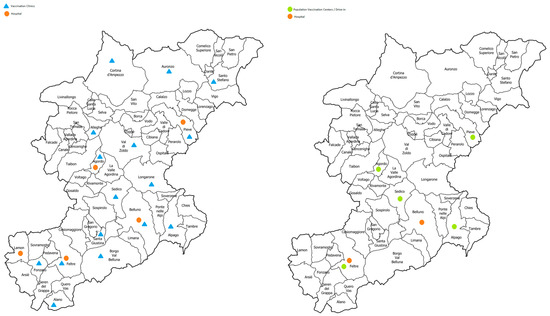 Distribution of vaccination access points in the ULSS 1 Dolomiti territory in 2019 (on the left—the orange dots represent the hospital facilities and the green triangles represent the local clinics belonging to the prevention department) and in 2021 (on the right—the orange dots represent hospital facilities and the green dots represent drive-in and “building” CVPs belonging to the prevention department).