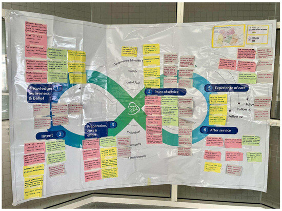 As a first step, the team selected a practitioner-friendly behavior change framework to apply to the formative research process. The team decided to use the Journey to Health and Immunization (JTHI) framework, a model and journey mapping tool developed by UNICEF and its partners in 2017 [20,21]. UNICEF and partners developed the JTHI in response to the limitations of applying other behavior change theories such as the Health Belief Model to caregiver vaccination and health behaviors [22]. The JTHI enables practitioners to understand both caregiver and health worker journeys, providing valuable insights into their experiences and challenges across six essential domains (Figure 1) that affect caregivers and health workers before, during, and after vaccination services are delivered [20,23].