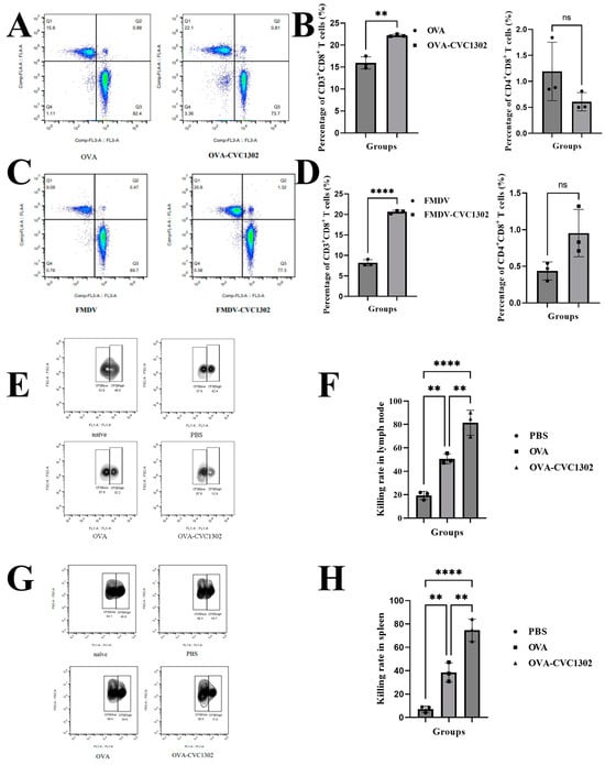 CVC1302 treatment led to an enhanced CTL response. (A,B) C57BL/6J mice were immunized with OVA or OVA-CVC1302. Inguinal lymph nodes were sampled from mice at 7 dpi and analyzed via flow cytometry. (A) Representative flow cytometry plot showing CD3+ CD8+ T cells. (B) Percentages of CD3+ CD8+ T cells (left) and percentages of CD4+ CD8+ T cells (right) in mice. (C,D) Piglets were immunized with FMDV or FMDV-CVC1302. Sera were sampled from piglets at 28 dpi. PBMCs were prepared and analyzed using flow cytometry. (C) Representative flow cytometry plot showing CD3+ CD8+ T cells. (D) Percentages of CD3+ CD8+ T cells (left) and percentages of CD4+ CD8+ T cells (right) in piglets. (E,H) SIINFEKL peptide-pulsed target cells were transferred into mice immunized with OVA or OVA-CVC1302 at 7 dpi. The killing rates of the target cells were analyzed using flow cytometry. (E) Representative cytometry plot showing the target cells in the lymph nodes of mice immunized with OVA or OVA-CVC1302. (F) Killing rates in the lymph nodes of mice immunized with OVA or OVA-CVC1302. (G) Representative cytometry plot showing the target cells in the spleens of mice immunized with OVA or OVA-CVC1302. (H) Killing rates in the spleens of mice immunized with OVA or OVA-CVC1302. Data are presented as the mean ± SEM; ** p ≤ 0.05, **** p ≤ 0.0001.
