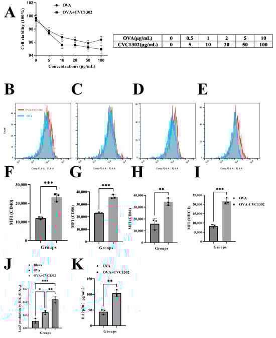 CVC1302 improved antigen cross-presentation by Flt3-L-cultured BMDCs. (A) The cytotoxicity of CVC1302 in Flt3-L-cultured BMDCs. A series of concentrations of CVC1302 were incubated with BMDCs for 12 h, and cellular viability was measured using the CCK-8 assay. (B–I) The activation of BMDCs treated with OVA±CVC1302 for 6 h. The cell surface expression of CD40, CD80, CD86, and MHCI in BMDCs was assessed by flow cytometry. (B) Representative cytometry plot showing the expression of CD40 in BMDCs. (C) Mean fluorescence intensity of CD40 in the BMDCs. (D) Representative cytometry plot showing the expression of CD80 in BMDCs. (E) The mean fluorescence intensity of CD80 in BMDCs. (F) Representative cytometry plot showing the expression of CD86 in BMDCs. (G) The mean fluorescence intensity of CD40 in BMDCs. (H) Representative cytometric plot showing the expression of MHCI in BMDCs. (I) Mean fluorescence intensity of MHCI in the BMDCs. (J) β-galactosidase production by B3Z cells after co-culture with BMDCs pre-treated with OVA±CVC1302 for 24 h. (K) The expression levels of IL-12p70 in BMDCs treated with OVA±CVC1302 for 6 h. Data are presented as the mean ± SEM; * p ≤ 0.01, ** p ≤ 0.01, *** p ≤ 0.001.