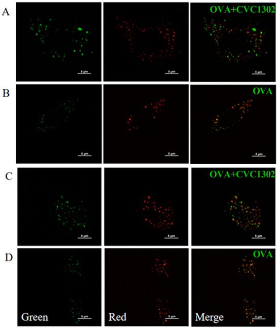 CVC1302 engages in the cytosolic pathway during cross-presentation. BMDCs were pulsed with OVA-FITC±CVC1302, chased at the indicated time points, and immunostained to assess the degree of OVA co-localization with LysoTracker Red DND-99 (lysosome). (A) BMDCs were treated with OVA+CVC1302 for 40 min. (B) BMDCs were treated with OVA for 40 min. (C) BMDCs were treated with OVA+CVC1302 for 60 min. (D) BMDCs were treated with OVA for 60 min. Scale bars: 5 μm.