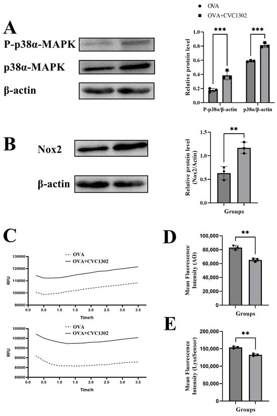 The BMDCs treated with OVA or OVA+ CVC1302 were harvested and lysed with a RIPA buffer (CST) containing a protease and phosphatase inhibitor cocktail. Western blot analysis was performed as described previously []. The sample protein was loaded and resolved on a 12% SDS-PAGE gel and transferred to the PVDF membrane. After blocked with 5% BSA in PBST for phosphor-protein and 5% non-fat milk for total protein in PBST for 1 h, the membranes were probed with anti-total p38α, anti-phosphor-p38α-T180/Y182, anti-NOX2/gp91phox, and anti-β-actin primary antibodies. Then, the membranes were extensively washed with PBST, followed by incubation with goat anti-rabbit IgG-HRP antibodies diluted in 5% non-fat milk in PBST for 1 h at 37 °C. Protein bands were visualized using the ECL prime western blotting detection reagent. The relative expression levels of target proteins according to the grayscale of β-actin or the indicator proteins in cells were assayed using ImageJ 10.8.1 software, as described previously [].