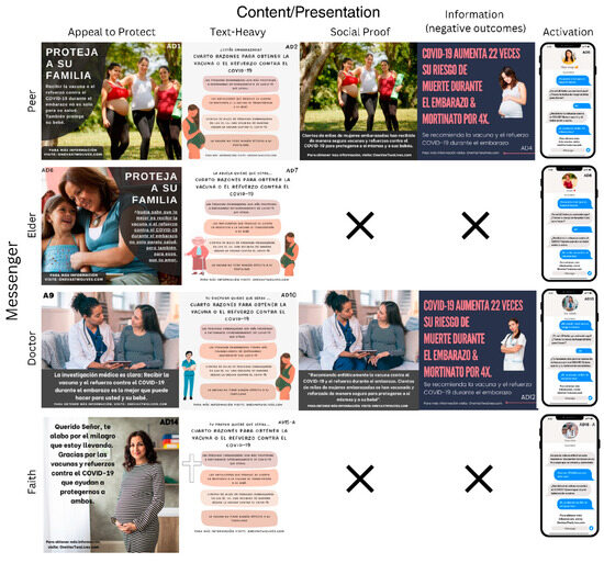 To evaluate the effect and efficacy of social media advertisements in the Hispanic population, we designed 16 unique ads promoting the COVID-19 vaccine. Each advertisement featured a specific messenger (peer, doctor, elder, faith leader) and content type (appeal to protect, text heavy, social proof, information on negative outcomes, or activation). Design of the advertisements and marketing principles were similar to our previously published methods in an English-speaking rural population [21], but the ads were designed specifically for a Hispanic pregnant population in Spanish.