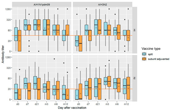 Antibody dynamics throughout 1 year after vaccination with subunit-adjuvanted vaccine (n = 46) or split vaccine (n = 27). Data are represented by a box plot diagram with a solid black line at the median titer. Cross symbol indicates the group geometric mean titer (GMT). Red lines indicate the conventional antibody level threshold adopted in this study: 1:40 for HI antibodies and 1:20 for NI antibodies.