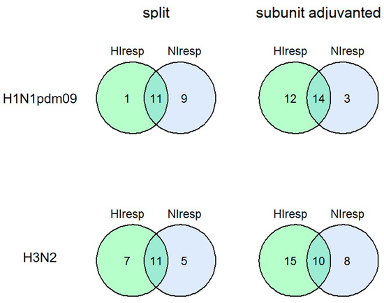 Combined seroconversions of HI and NI antibodies on day 21 after vaccination with split or subunit-adjuvanted IIVs presented by Venn’s diagrams. Numbers in circles present absolute number or responders in one or both tests. The total number of participants was 27 in the split vaccine group and 46 in the subunit-adjuvanted vaccine group. The number of non-responders to both antigens is not shown on Venn’s diagram.