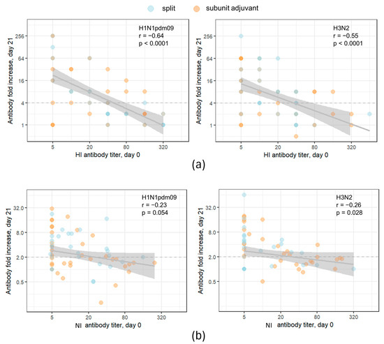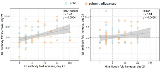 Correlation between post-vaccination HI and NI antibody fold increases. Each dot represents one participant. The results of the Pearson correlation test applied to logarithmic values are presented on graphs. The population in the analyses included all participants, regardless of the vaccine type. The shaded area represents the 95% CI for the regression line. The dashed lines mark the conventional seroconversion threshold (4-fold increase in HI antibody titer and 2-fold increase in NI antibody titer).