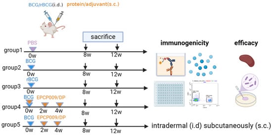 Specific pathogen-free 4- to 6-week-old female Balb/c mice were obtained from Beijing HFK Bioscience Co., Ltd. (Beijing, China). In order to evaluate the impact of different immunization schemes (shown in Figure 1), the mice were randomly divided into five groups of six mice each for vaccination. Mice of group 1 (PBS) were immunized with 100 μL of phosphate-buffered saline (PBS, pH 7.4); mice of groups 2 (BCG) and 3 (rBCG-EPCP009) were immunized intradermally with 1 × 106 colony-forming units (CFUs) of the BCG/rBCG strain in 100 μL of PBS (pH 7.4); mice of group 4 (BCG + EPCP009) were immunized intradermally with 1 × 106 CFUs of the BCG strain at week 0 and immunized subcutaneously three times (at weeks 0, 2, and 4) with 10 μg EPCP009 protein formulated in DP (composed of 250 μg dimethyldioctadecylammonium [DDA]/50 μg poly I:C) in 100 μL of PBS (pH 7.4); mice of group 5 (EPCP009) were immunized subcutaneously three times (at weeks 0, 2, and 4) with 10 μg EPCP009 protein formulated in DP. Eight or twelve weeks from the first immunization, blood samples were collected from the orbits of the mice and they were sacrificed by cervical dislocation. The coagulated blood was centrifuged at 4000 rpm for 10 min, and the serum was stored at −20 °C for antibody titer analysis. Spleen cells were isolated under aseptic conditions by using mouse lymphocyte separation medium (Dakewe, Beijing, China) according to the manufacturer’s instructions.