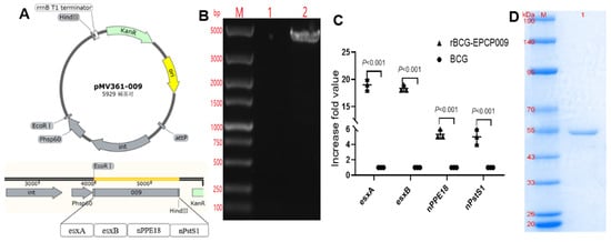 The expression plasmid pET43.1a-009 and shuttle plasmid pMV361-009 were constructed by Universal Biosystems Co., Ltd. (Anhui, China). The procedure is briefly described here: EPCP009 (esxA, esxB, nPPE18, and nPstS1 genes) was attached to the pET43.1a vector and pMV361 vector via a linker. The gene sequence of EPCP009 is depicted in Table S1. As an integral component of fusion protein recombination, the linker is an amino acid chain that connects two fusion genes and has a certain degree of flexibility that allows the proteins on both sides to perform their independent functions []. Non-polar hydrophobic amino acids, such as glycine (Gly) and serine (Ser), are commonly used. In the design of our fusion protein vaccines, the linker we chose was Gly-Gly-Ser-Gly-Gly, which is encoded by the GGTGGTTCTGGCGGT sequence.
