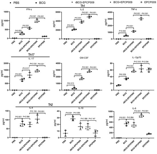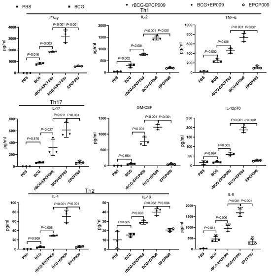 Twelve weeks after the initial immunization, mouse spleen lymphocytes were stimulated with the EPCP009 protein (Figure S2). The PBS and BCG groups of mice secreted low levels of the EPCP009-specific cytokines. The BCG+EPCP009 group of mice produced significantly higher levels of IFN-γ, IL-2, TNF-α, IL-17, GM-CSF, and IL-6 than the rBCG-EPCP009 and EPCP009 groups of mice (p < 0.05). The levels of IL-4 and IL-10 produced by mice from all of the groups were lower than 100 ng/μL.