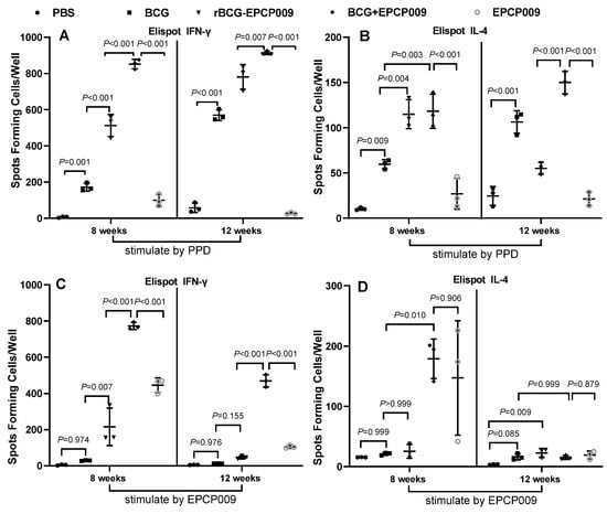 At 8 and 12 weeks after the first immunization, spleens were isolated under aseptic conditions and stimulated with 2 μg PPD and 2 μg EPCP009, and the culture supernatant was assayed for the Th1-type cytokine IFN-γ and the Th2-type cytokine IL-4 using the ELISpot kit.