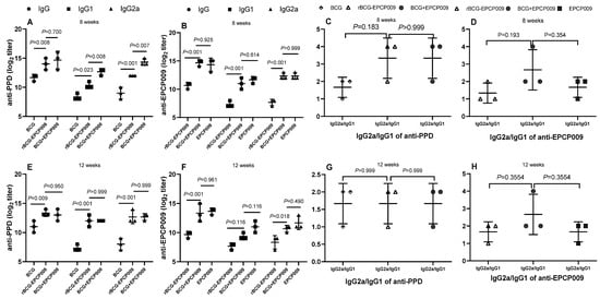 Antibody response of IgG, IgG1, and IgG2a in Balb/c mice immunized with different vaccine candidates at 8 or 12 weeks after the initial immunization. (A) PPD-specific and (B) EPCP009-specific antibodies titers of total IgG, IgG1, and IgG2a at 8 weeks. (C) PPD-specific and (D) EPCP009-specific of IgG2a/IgG1 ratio at 8 weeks. (E) PPD-specific and (F) EPCP009-specific antibodies titers of total IgG, IgG1, and IgG2a at 12 weeks. (G) PPD-specific and (H) EPCP009-specific of IgG2a/IgG1 ratio at 12 weeks.