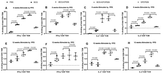 Proportions of various immune cells in spleen cells from immunized mice. Splenocytes from Balb/c mice immunized with the candidate vaccines were stimulated with the PPD antigen at 8 and 12 weeks, and the proportions of IFN-γ+CD4+TEM (A,E) and IFN-γ+CD8+TEM (B,F) cells and IL-2+CD4+TCM (C,G) and IL-2+CD8+TCM (D,H) cells were assessed by flow cytometry. The p-values indicating the significance of differences were determined by one-way ANOVA with Tukey’s multiple comparison tests.