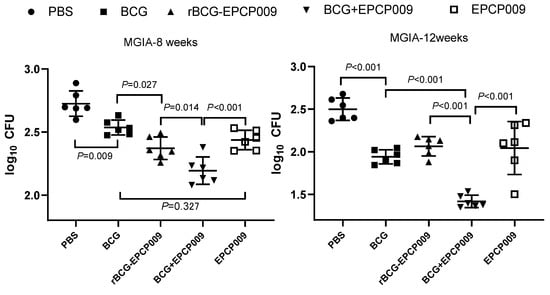 At 12 weeks after immunization, the PBS-negative control group still had the highest colony count, and the BCG, rBCG-EPCP009, BCG+EPCP009, and EPCP009 groups had significantly lower colony counts than the PBS group (p < 0.01). The number of colonies formed was significantly lower in the BCG+EPCP009 group than in the BCG group (p < 0.01), but there was no significant difference between the rBCG-EPCP009 and EPCP009 groups. Moreover, the colony counts in the BCG+EPCP009 group were significantly lower than those in the rBCG-EPCP009 (p < 0.001) and EPCP009 groups (p < 0.001). In conclusion, at 12 weeks after immunization, the BCG+EPCP009 group showed significantly better inhibition than the BCG, rBCG-EPCP009, and EPCP009 groups (Figure 8).