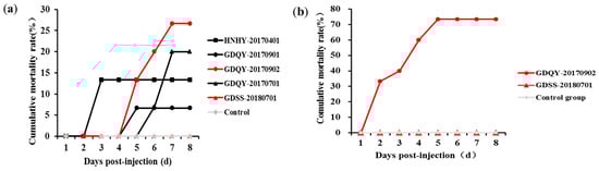 Cumulative mortality curves for different experimental groups injected with different LBBV strains. (a) At a dose of 5 × 104 TCID50 per fish. (b) At a dose of 5 × 106 TCID50 per fish.