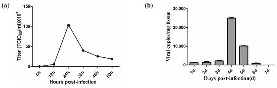The growth curve of the avirulent strain in the CPB cells was determined using a TCID50 assay. As shown in Figure 2a, the viral titer sharply increased from 12 to 24 hpi and then decreased from 24 to 48 hpi. The peak titer was 109.01 TCID50/mL at 24 hpi.