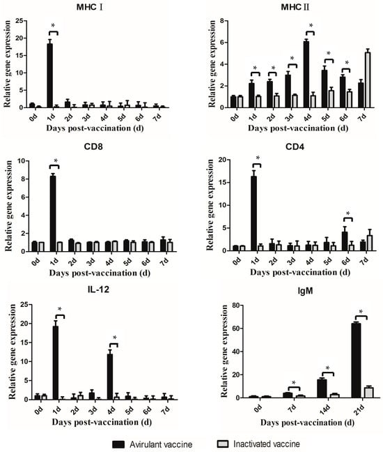 The gene expression levels of IL-12, MHCI, MHCII, CD8, and CD4 in spleens on 0, 1, 2, 3, 4, 5, 6, and 7 dpv and IgM in head kidneys on 0, 7, 14, and 21 dpv of three fish in each group were examined using qRT-PCR. The kinetics of the above gene expressions are shown in Figure 3. For the group vaccinated with the avirulent vaccine, the MHCI and CD8 gene expressions exhibited significant up-regulation with respective 18.3 and 8.3-fold increases at 1 dpv compared to the control group, and then they rapidly decreased. But for the group vaccinated with the inactivated vaccine, the MHCI gene expression showed no significant changes. As for the MHCII gene, a different expression pattern was observed. For the group vaccinated with the avirulent vaccine, MHCII expression was significantly increased at all time points examined and peaked at 4 dpv, with a 6.1-fold increase. For the group vaccinated with the inactivated vaccine, the MHCII expression increased at 7 dpv with a 5.1-fold increase and had no significant change before 7 dpv. Additionally, the CD4+ gene expression in the avirulent group also peaked at 1 dpv and 6 dpv with 16.3-fold and 4.1-fold increases compared to the control group. However, the inactivated group’s CD4 gene expression was mildly up-regulated and peaked at 7 dpv with a 3.3-fold increase. The IL-12 gene expression in the avirulent group up-regulated rapidly and reached a peak at 1 dpv with a 19.2-fold increase compared to the control group and then peaked again with 11.9-fold increase at 4 dpv. However, for the inactivated group, the IL-12 gene expression showed no significant change. At all the time points examined, IgM expression was significantly up-regulated compared to the control group and reached a peak with a 64-fold increase at 21 dpv. For the inactivated group, IgM expression was also up-regulated and peaked at 21 dpv with an 8.6-fold increase.