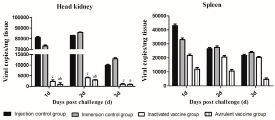 LBBV loads were detected by real-time PCR in the head kidneys and spleens of largemouth bass. Figure 5 shows that the viral loads in the head kidneys and spleens from different groups decreased with death time. The viral loads in the head kidneys from the avirulent group, inactivated group, immersion control group, and injection control group post challenge were 831~2977, 995~4012, 12,921~85,980, and 9921~82,980 copies/mg, respectively. The viral loads in the spleens from the avirulent group, inactivated group, immersion control group, and injection control group post-challenge were 4786~11,981, 20,480~21,716, 23,800~32,973, and 21,800~42,973 copies/mg, respectively. Interestingly, for the control group, the viral load in the head kidney was higher than that in the spleen, but for the vaccinated group, the viral load in the spleen was higher.