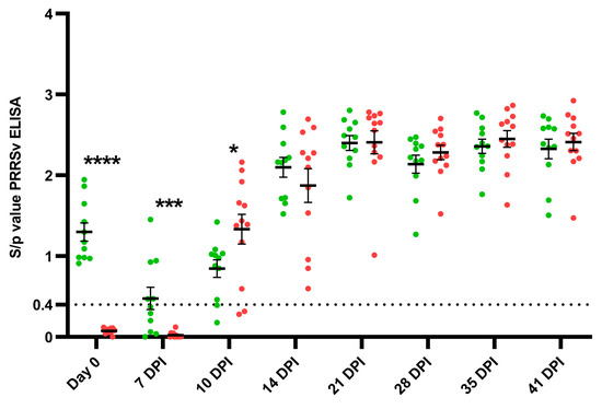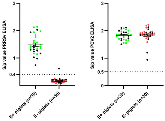 - Fiers, J.; Tignon, M.; Maes, D.; Cay, A.B. Follow-Up of PRRSV-Vaccinated Piglets Born from PRRSV-Vaccinated, ELISA-Seropositive and ELISA-Seronegative Sows. Viruses 2023, 15, 479. [Google Scholar] [CrossRef] [PubMed]
