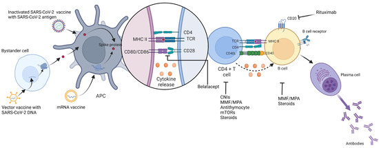 COVID-19(SARS-CoV-2) vaccine, generation of immunogenicity, and effects of immunosuppression on vaccine response. APC: antigen presenting cells, MHC: major histocompatibility complex, CNIs: calcineurin inhibitors, MMF: mycophenolate, MPA: mycophenolic acid, mTORs: mammalian target of rapamycin, TCR: T cell receptor.