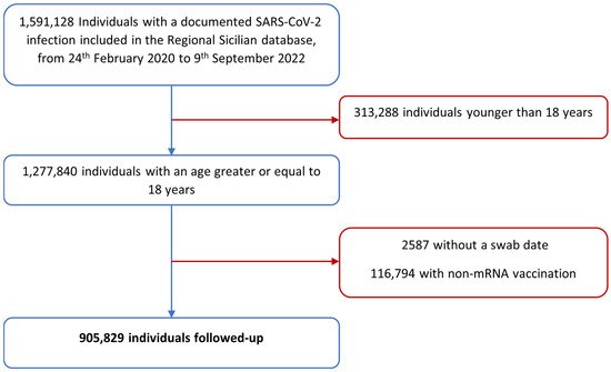The initial cohort included a total of 1,591,128 individuals with a documented SARS-CoV-2 infection registered in the Regional Sicilian database, from 24 February 2020 to 9 September 2022. Thereafter, the following individuals were excluded: 313,288 with an age of less than 18 years, 2587 without a swab date, 116,794 with non-mRNA vaccination, and 252,630 with a reinfection that occurred within 90 days since the previous infection. Hence, a total of 905,829 COVID-19 cases were included in our study (Figure 1).