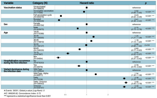 The determination of person-time at risk for reinfection was as follows: the date of diagnosis of the first episode of infection, as ascertained by a confirmatory test, constituted the entry time at risk for the entire sample. The follow-up period for subjects who were reinfected within 90 days of their first diagnostic test was defined as the timeframe until the date of diagnosis of the second episode. The remaining participants were subject to censorship on 9 September 2022, the date of data extraction. The resulting value, expressed as 100 person-years, was the incidence density of reinfection (95% CI), which was calculated by dividing the number of reinfected subjects by the total person-days at risk. Furthermore, the risk of reinfections was evaluated using a multivariable Cox proportional hazard model. Each hazard ratio (HR) and 95% CI is adjusted for sex, age group, vaccination status, hospitalization during the first infection, and SARS-CoV-2 variant.