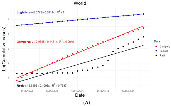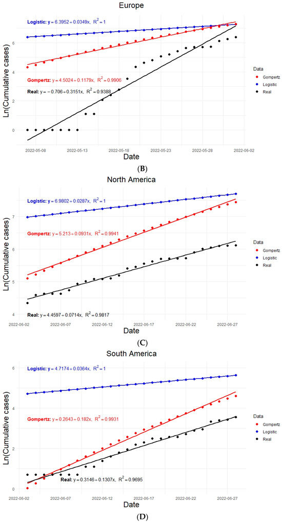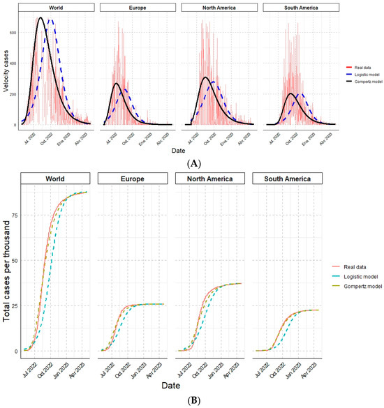 Finally, the results estimated by the logistic and the Gompertz models were compared with the actual data and observed simultaneously. The contagion rate of Monkeypox cases by each analyzed geographic region (Figure 2A) and the cumulative cases (Figure 2B) are shown: