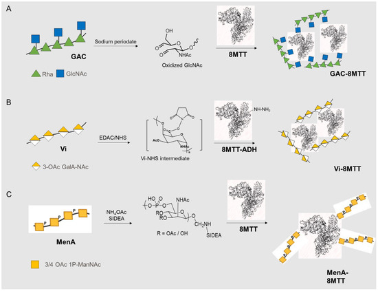 Strategies to produce 8MTT glycoconjugates: (A) aldehyde groups randomly generated through oxidization of GAC were linked to carrier protein lysines by reductive amination; (B) protein derivatization with ADH and conjugation to Vi PS by carbodiimide chemistry; (C) MenA OS (as an example of all Men OSs) terminally activated with SIDEA and linked to lysines of the carrier protein.