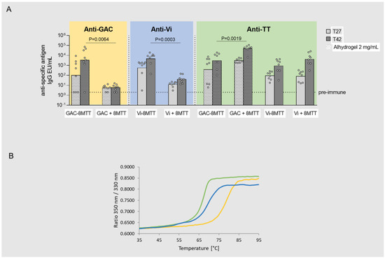 (A) Immunogenicity of GAC and Vi physically mixed (GAC + 8MTT and Vi + 8MTT) or glycoconjugated to 8MTT (GAC−8MTT and Vi−8MTT). CD1 mice were immunized intraperitoneally (i.p.) at days 0 and 28 with 1.5 µg GAC/dose or 1.0 µg Vi/dose, and 3.2 µg or 1.9 µg 8MTT, respectively. GAC groups were all formulated with 2 mg/mL Alhydrogel. Sera collected at days 27 (T27) and 42 (T42) were analyzed by enzyme-linked immunosorbent assay (ELISA), using GAC−HSA, Vi and TT as coating antigens. Individual anti-antigen specific IgG EU/mL are reported as dots, with bars corresponding to groups’ geometric means. (B) Differential scanning fluorimetry (DSF) F330/350 fluorescence ratio intensity of 8MTT (green line), GAC−8MTT (yellow line), and Vi-8MTT (blue line) plotted against temperature.