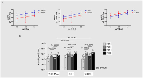 Immunogenicity in mice of Vi glycoconjugated to 8MTT (Vi−8MTT), TT (Vi−TT), or CRM197 (Vi−CRM197). CD1 mice were immunized intraperitoneally (i.p.) at days 0 and 28 with 1.0 µg Vi/dose (corresponding to 1.9 µg of 8MTT, 2.0 µg of TT, and 2.4 µg of CRM197) without Alhydrogel. (A) Parallel line analysis showing dose-response curves at day 42 of the different formulations (log transformed IgG EU/mL titers in Y axis and log transformed Vi doses in X axis); (B) a third immunization was performed at day 98. Sera collected at days 27 (T27), 42 (T42), 97 (T97), and 112 (T112) were analyzed by ELISA. Individual anti-Vi IgG EU/mL are reported as dots, with bars corresponding to groups’ geometric means.