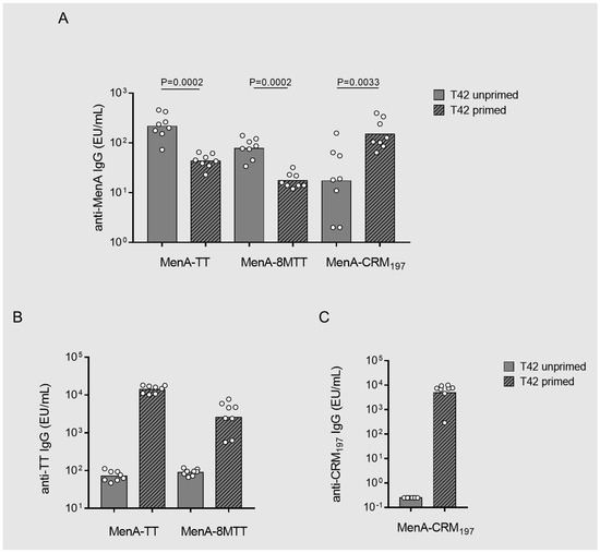Immunogenicity in mice of MenA glycoconjugated to 8MTT (MenA−8MTT), TT (MenA−TT), or CRM197 (MenA−CRM197). Balb/c mice were immunized subcutaneously (s.c). All groups received 50 µg of the carrier proteins (primed groups, line pattern) or Alum phosphate at 0.6 mg/mL (unprimed groups, no pattern) at days 0 and 14 and 2.0 µg of corresponding MenA glycoconjugates (corresponding to 8 µg of 8MTT, 6.9 µg of TT, and 5 µg of CRM197) at day 28 with Alum phosphate at 0.6 mg/mL as adjuvant. Sera were collected at day 42 (T42). Summary graphs of anti-MenA (A), anti−TT (B), and anti−CRM197 (C) specific IgG geometric mean units (bars) and individual antibody levels (dots) are reported.