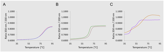 Differential scanning fluorimetry (DSF) F330/350 fluorescence ratio intensity of (A) TT (red line) vs. MenA−TT (blue line); (B) 8MTT (green line) vs. MenA−8MTT (brown line); (C) CRM197 (violet line) vs. MenA−CRM197 (orange line), plotted against temperature.