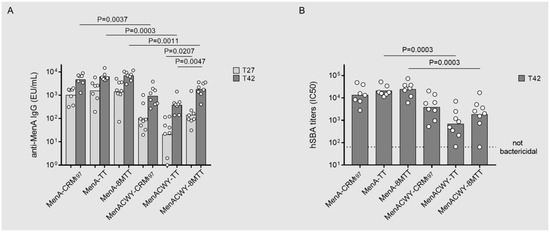 Immunogenicity in mice of MenA glycoconjugated to 8MTT (MenA−8MTT), TT (MenA−TT), or CRM197 (MenA−CRM197) and MenACWY corresponding tetravalent formulations. Balb/c mice were immunized subcutaneously (s.c) at days 0, 14 and 28 with 2.0 µg MenA/doses and 1 µg MenCWY/doses with Alum phosphate at 0.6 mg/mL. Sera collected at days 27 (T27) and 42 (T42) were analyzed by ELISA using MenA PS as the coating antigen (A) and by serum bactericidal assay using human sera as the source of complement (hSBA) only at day 42 (T42) (B). Geometric mean units (bars) and individual antibody levels (dots) are reported.