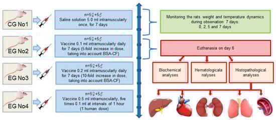We assessed the vaccine’s acute intramuscular toxicity by administering a single human dose in mice of both sexes after fasting them overnight (i.e., leaving them no access to food and letting them have only water for approximately 12–15 h). We then performed an acute intramuscular toxicity experiment on rats where we introduced 10 human doses into the animal models of both sexes. We divided the models randomly into two groups: an experimental and a control group. As a comparator substance, we administered PBS to the control group. We fed the models 4 h after administering the vaccine and the comparator substance. We observed the animals for clinical signs and death the first 2 h after the injection, then every 2 h until the end of day 1, and then on day 2, day 7, and day 14. We monitored body weight changes in the models on days 0, 2, 7, and 14. On day 14, we sacrificed all animals and performed a macroscopic observation of their organs and tissues. We fixed the organs in a 10% neutral buffered formalin and performed their histopathological examination [