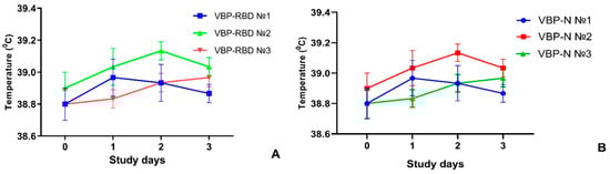 We administered the tested product into the models’ marginal ear vein in the volume of 0.5 mL per 1 kg of body weight. A day before the start of the experiment, we measured the rabbits’ body temperatures and stopped feeding them while allowing them to access water. Before use, we heated a vaccine sample to 35 °C and introduced it within 15–30 min following the latest body temperature measurement. After administering the vaccine, we measured the animal’s body temperature every hour for 3 h.